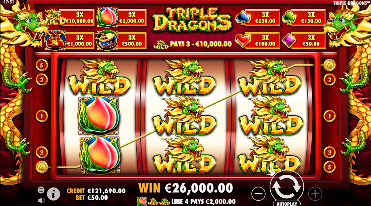 ほとんどのスロットが持つさまざまなボーナス機能や特殊シンボルが不要なら、『Triple Dragons』を十分に楽しむことができるでしょう。ミニマリストスロットの例としては、これ以上のものはなかなか見つかりません。